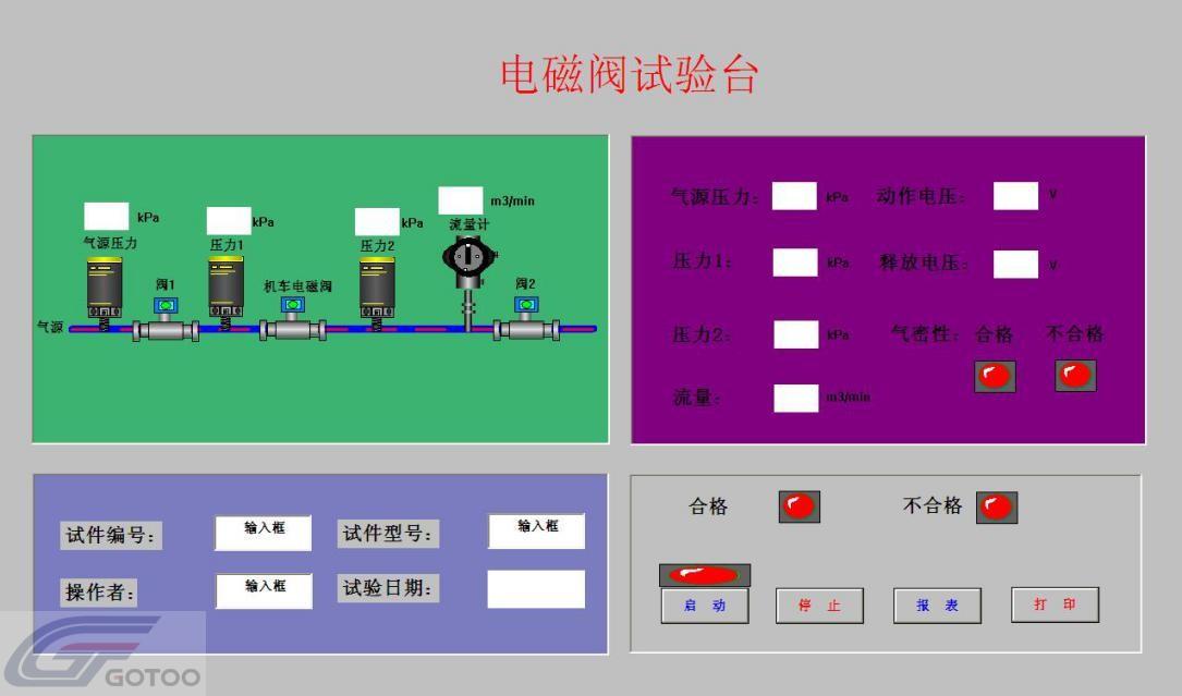 The test stand is composed of a computer control system, a test piece fixing device, an imported pneumatic component, a pressure sensor, a DC stabilized power supply, a precision digital display instrument, and a data acquisition board card, etc., It can undertake insulation performance of solenoid valve, air tightness and suction release voltage and output electric signal function test.